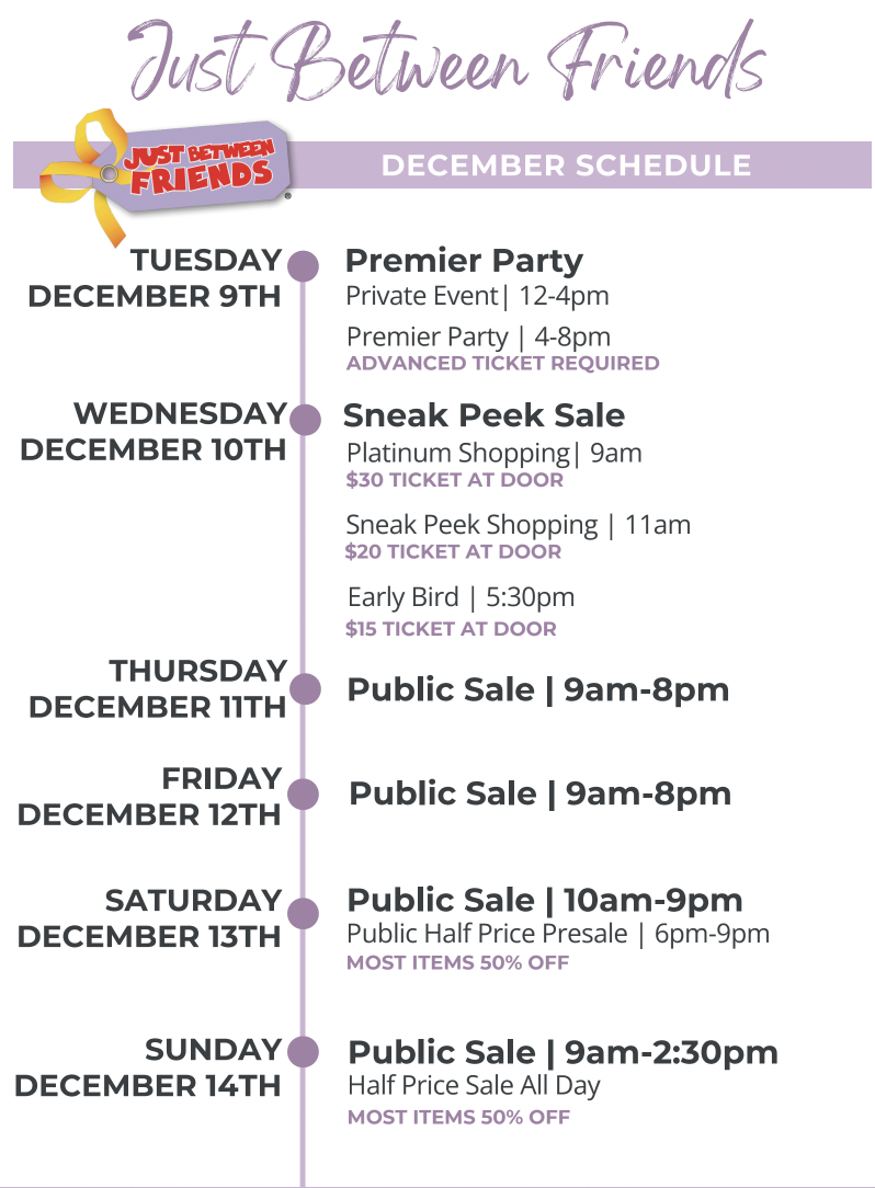 Get ready for one of the biggest shopping events of the season! The Just Between Friends December Sale is your chance to score incredible deals on quality kids’ items—from clothing and toys to baby gear, books, and so much more. With multiple shopping opportunities throughout the week, you can choose the experience that fits your schedule (and your bargain-hunting style!).